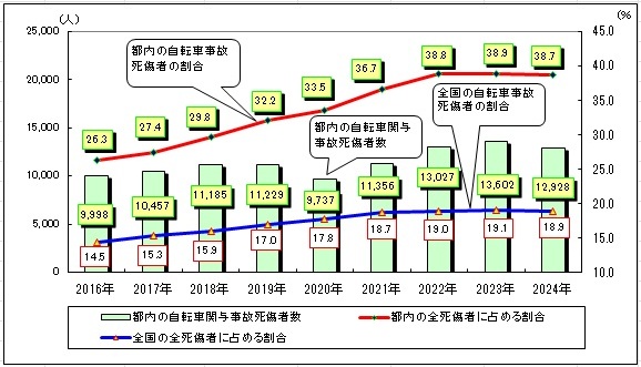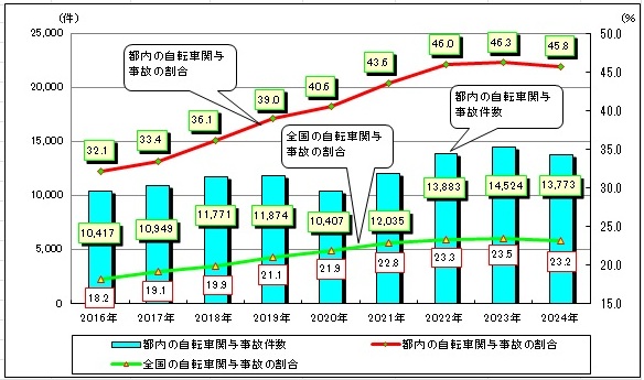 都内における自転車の交通事故の発生件数・死傷者数は増加傾向にあります。2024年の全交通事故に占める自転車事故の割合を見ると、発生件数では約45%(全国の約1.97倍)、